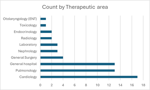 Looking at the most recent data from recalls, the 2023 class I recalls shows a similar pattern to prior years, with some new information.[ix]  Of the 59 recalls, 22% were for heart pumps, 17% for general IV pumps, 15% for ventilators. Hemodialysis equipment, defibrillators and assistive breathing (CPAP) had 3% each, with 18% from various other devices including COVID-19 and heart attack lab tests. Putting that information another way, most device recalls were for heart (cardiology) and lung (pulmonology) devices (Fig 1). For device manufacturers working in these areas with these devices, prospective data collection studies may also be very beneficial.
